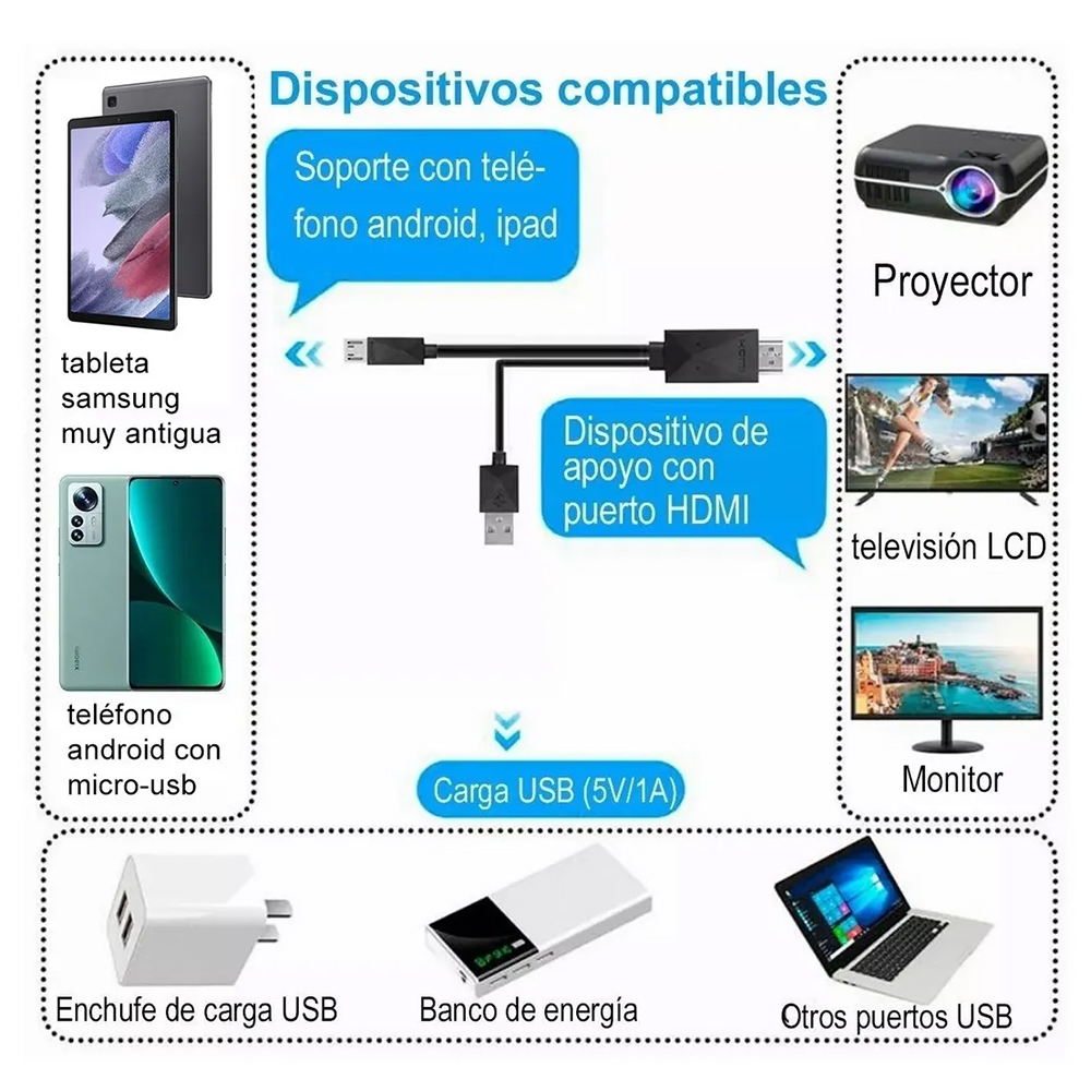 • Funcionalidad: Permite la transmisión de video y audio desde su dispositivo móvil a la pantalla HDMI. Esto le permite ver fotos, videos y jugar juegos en una pantalla más grande4