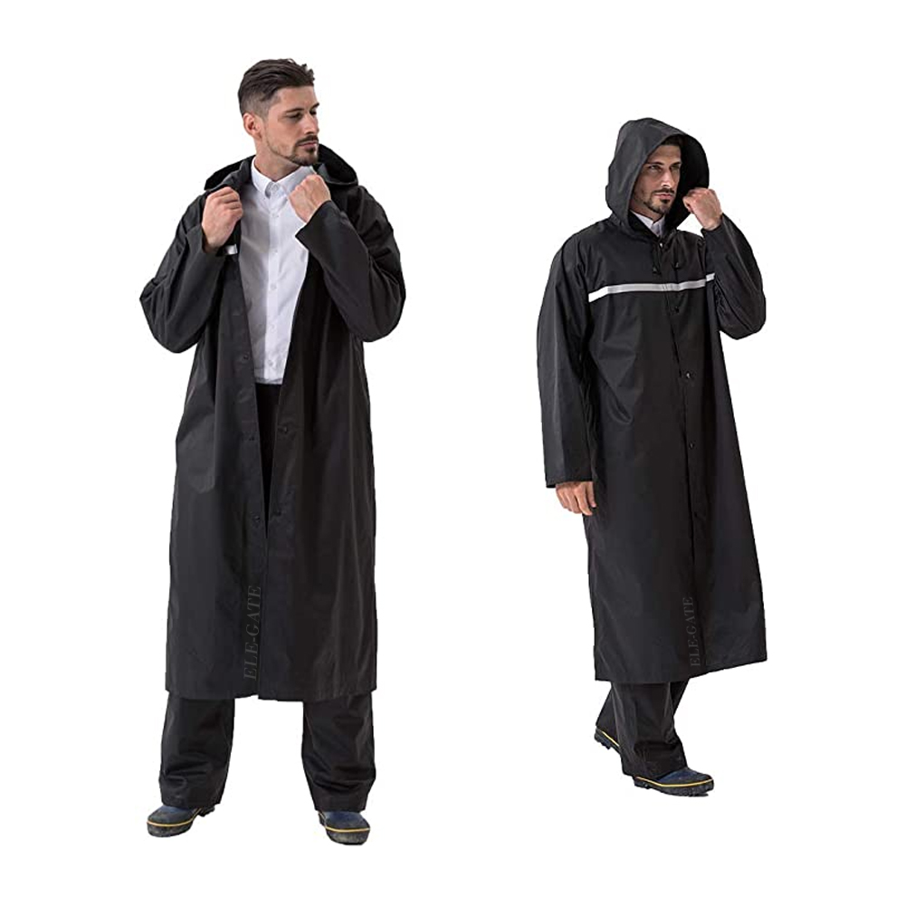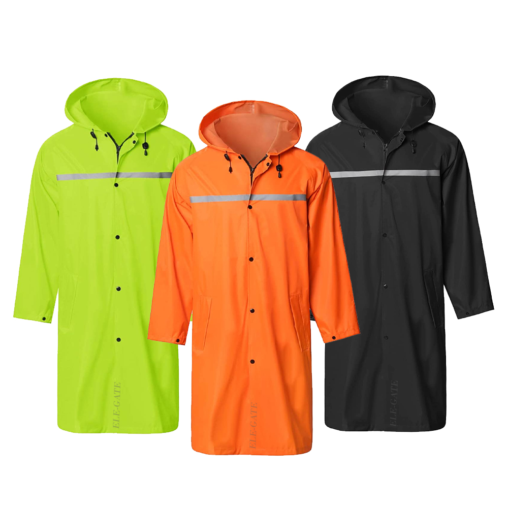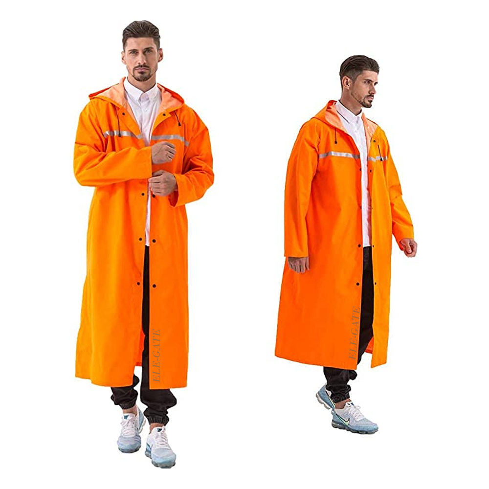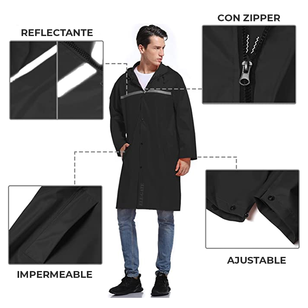 Características: chamarra de lluvia larga hasta la rodilla, puños ajustables con broches, mangas largas, cierre resistente y solapa de tormenta con broches, dos bolsillos frontales para las manos, capucha ajustable con cordón
