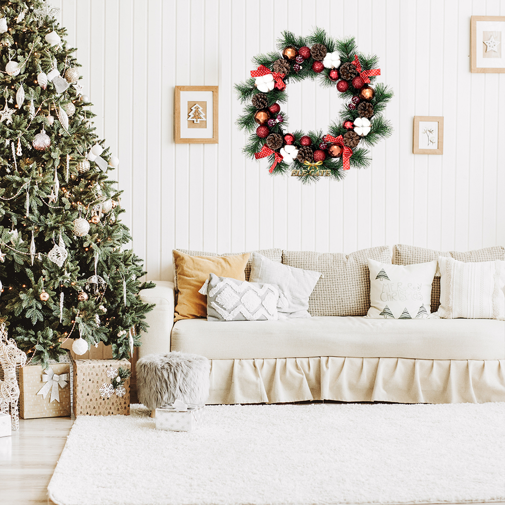 Coronas Navideñas de 50 CM con esferas combinadas con el color del moño. Ideal para adornar tu casa, la oficina o las entradas gracias a su tamaño y a su excelente acabado.