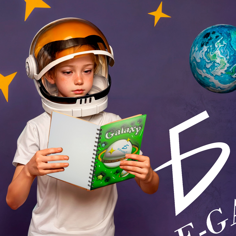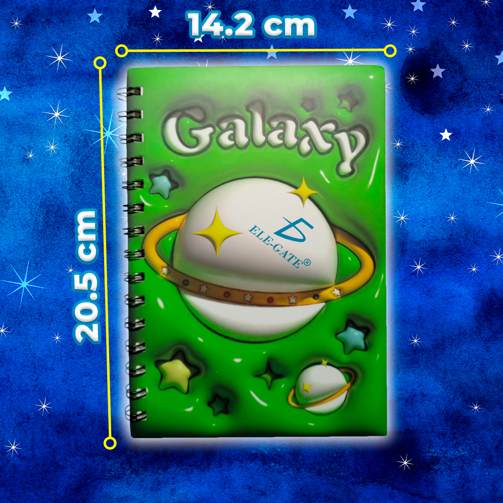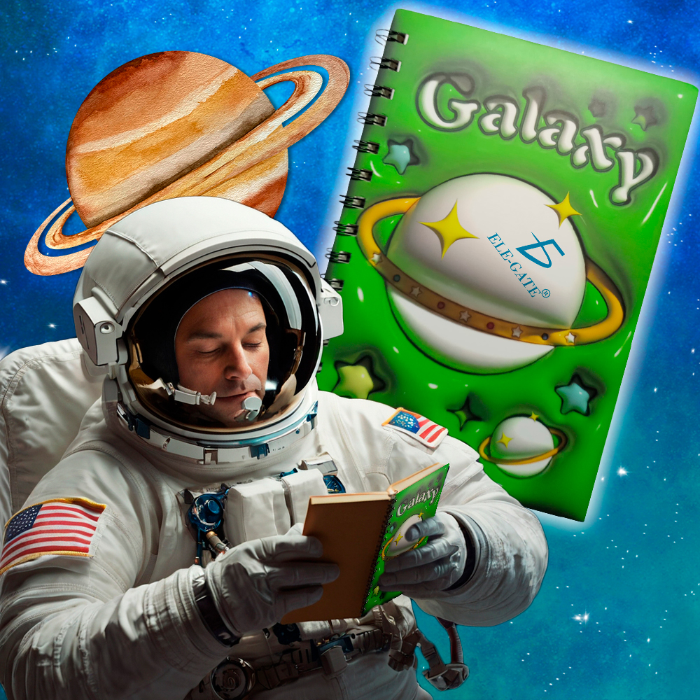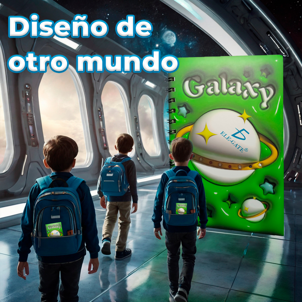 Este cuaderno es ideal para todo tipo de usos, ya sea para la escuela, la universidad, la oficina o actividades personales. La pasta dura y el espiral metálico lo hacen muy resistente y práctico de transportar. Su diseño espacial le da un toque muy original y atractivo.