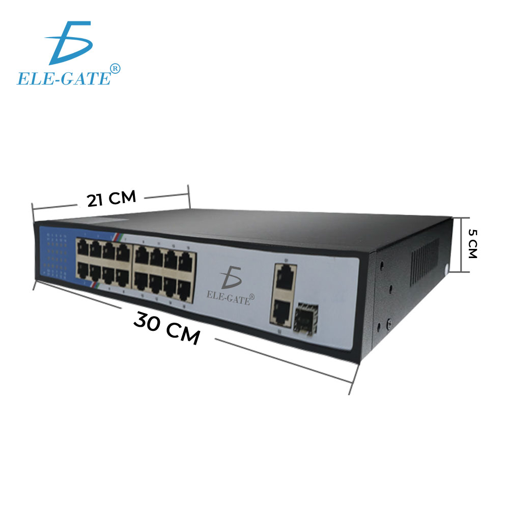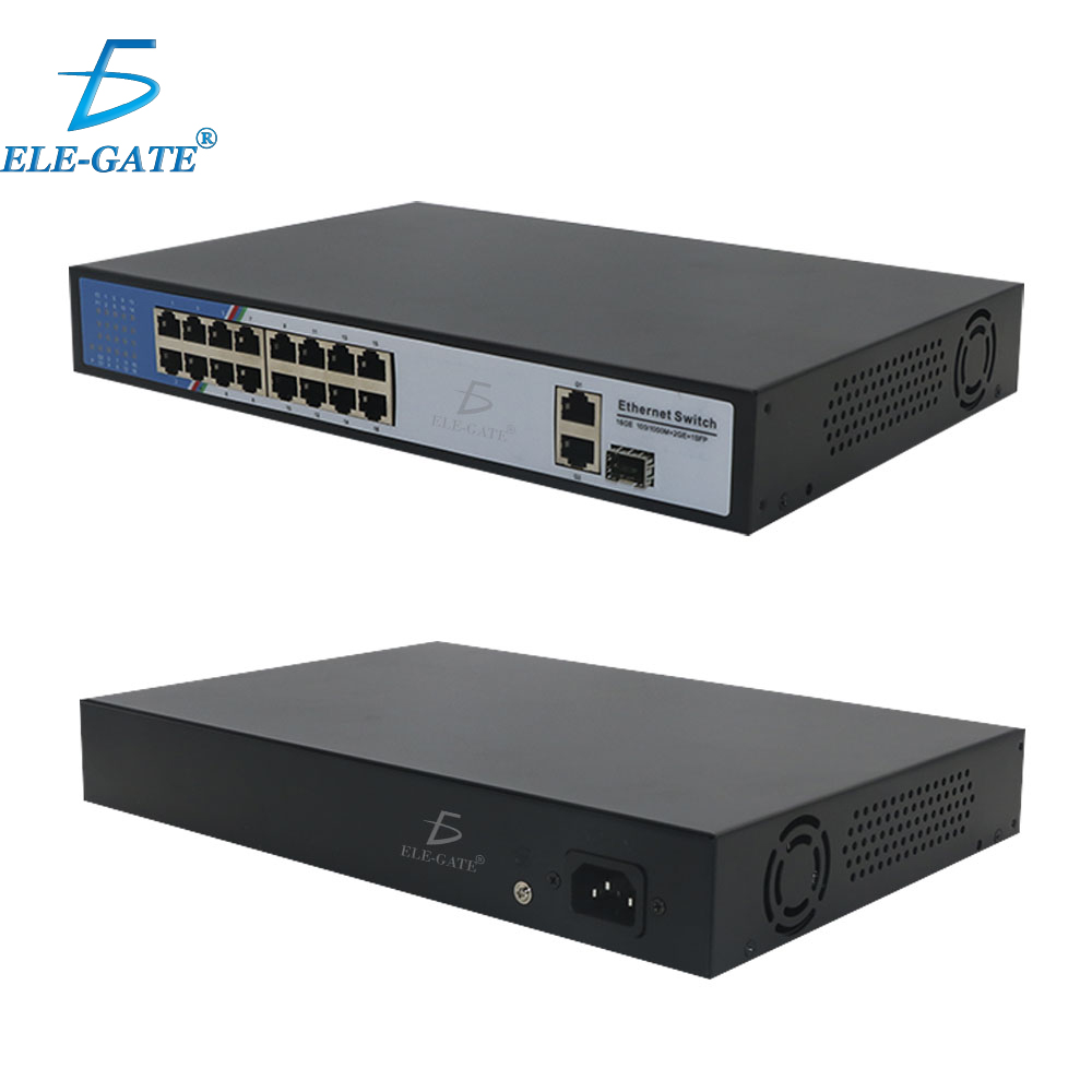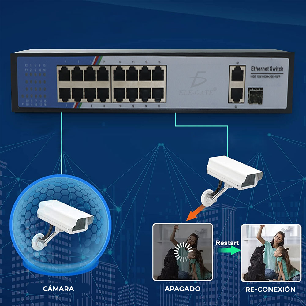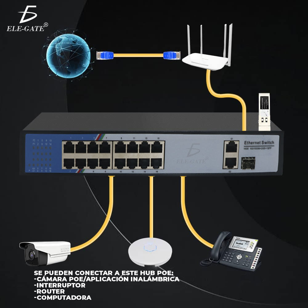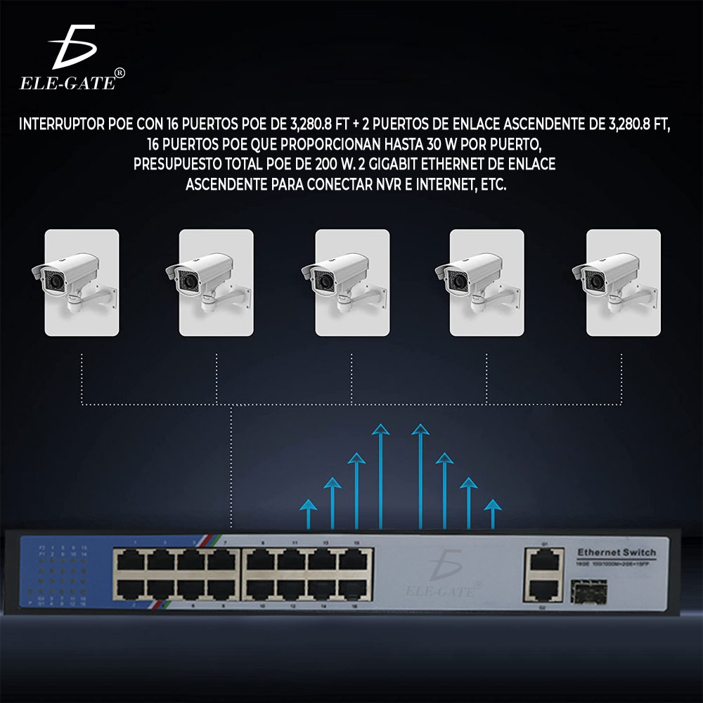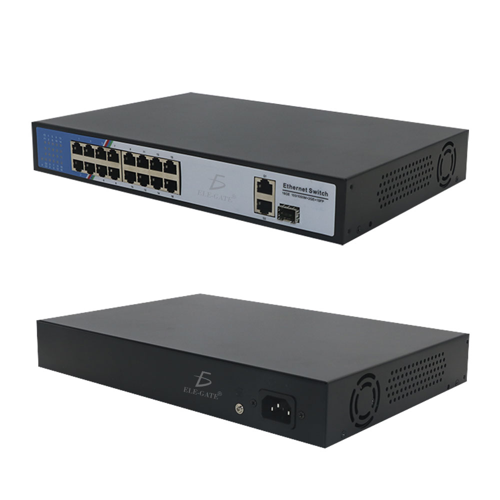 Interruptor PoE+ de 16 puertos, presupuesto de energía interna máximo total de 250 W, hasta 30 W por puerto PoE, puerto de enlace ascendente adicional de 2 gigabit. Cumple con IEEE802.3af/at, detecta e identifica automáticamente dispositivos PD.