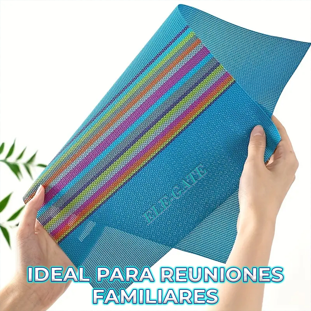 Cada set contiene 10 manteles individuales, lo que te permite decorar toda tu mesa con un estilo único y coordinado. El diseño antideslizante en la parte inferior asegura que los manteles se mantengan en su lugar, evitando que se deslicen o se muevan durante las comidas.
