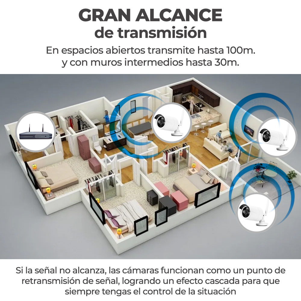 En espacios abiertos transmite hasta 100 metros, con muros intermedios hasta 30 metros.