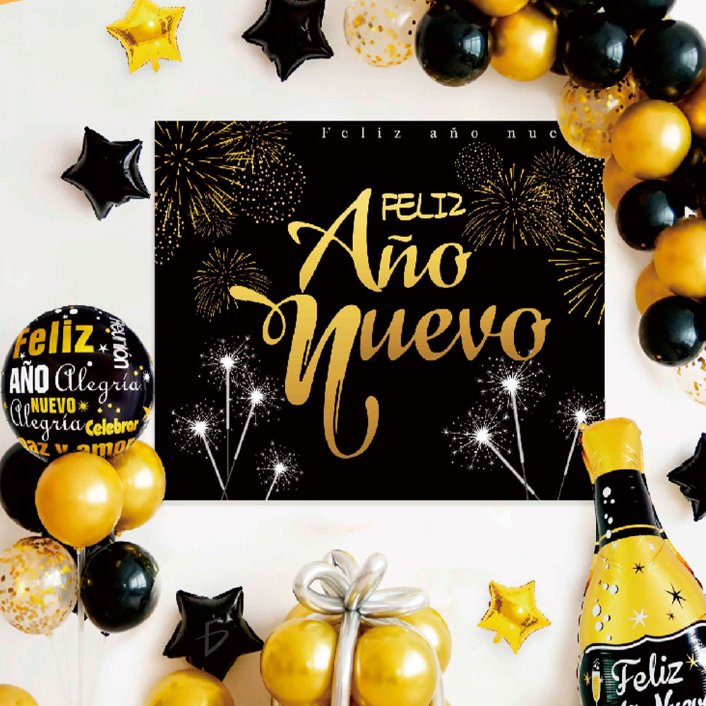 - Contenido: Globos de papel de aluminio de “Feliz Año Nuevo” + Globos de látex dorado con confeti