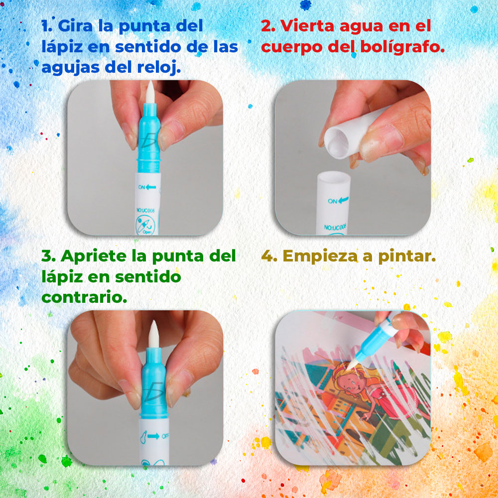 • Fácil y Limpio: La pluma con agua es segura y limpia. Los colores aparecen inmediatamente y desaparecen después de unos minutos.