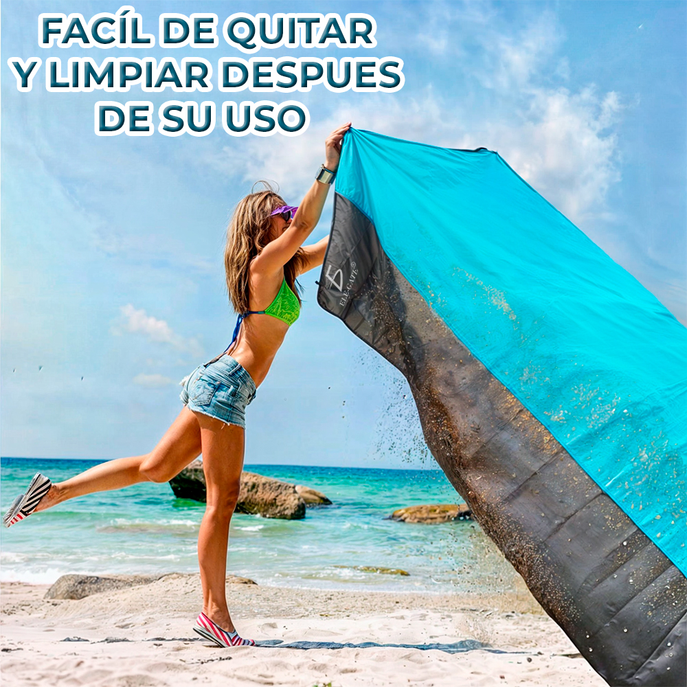 - Repelente al agua, arena y tierra: Material especializado que evita que la manta se ensucie o se moje fácilmente, manteniendo su limpieza.