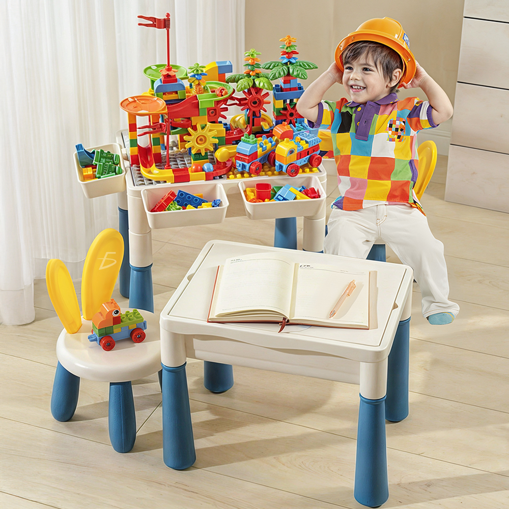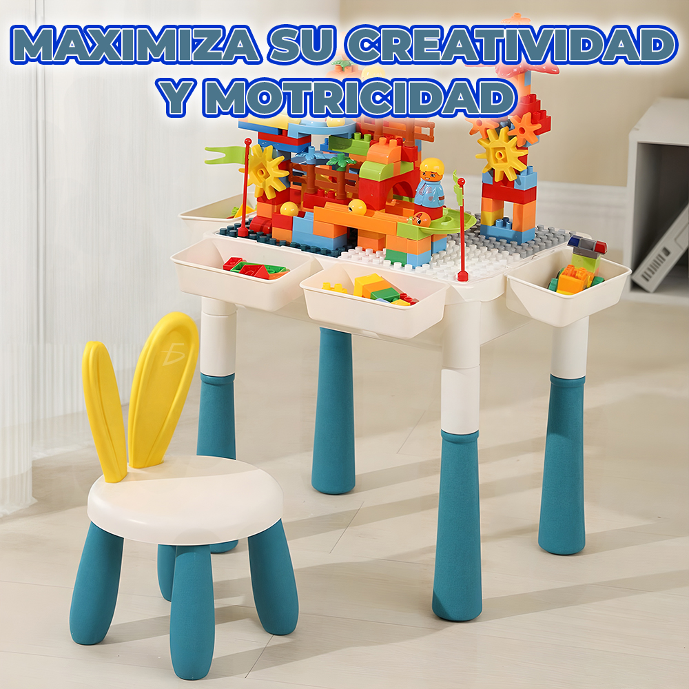Mesa de Bloques Didáctica Incluye 346 Bloques y dos Sillas con Respaldo en Forma de Orejas. Gracias a su espacio interior puedes mantener todos sus bloques y piezas juntas. Ideal para que tu pequeño desarrolle su creatividad y motricidad.