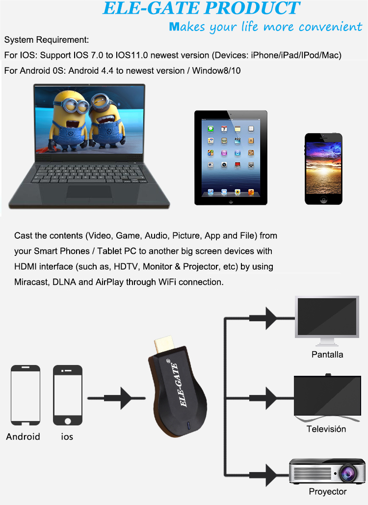 Contenido del paquete: 1 x MiraScreen  Wireless HDMI Dongle bilingüe, 1 x USB cable, 1 x Manual de usuario en Inglés y Chino