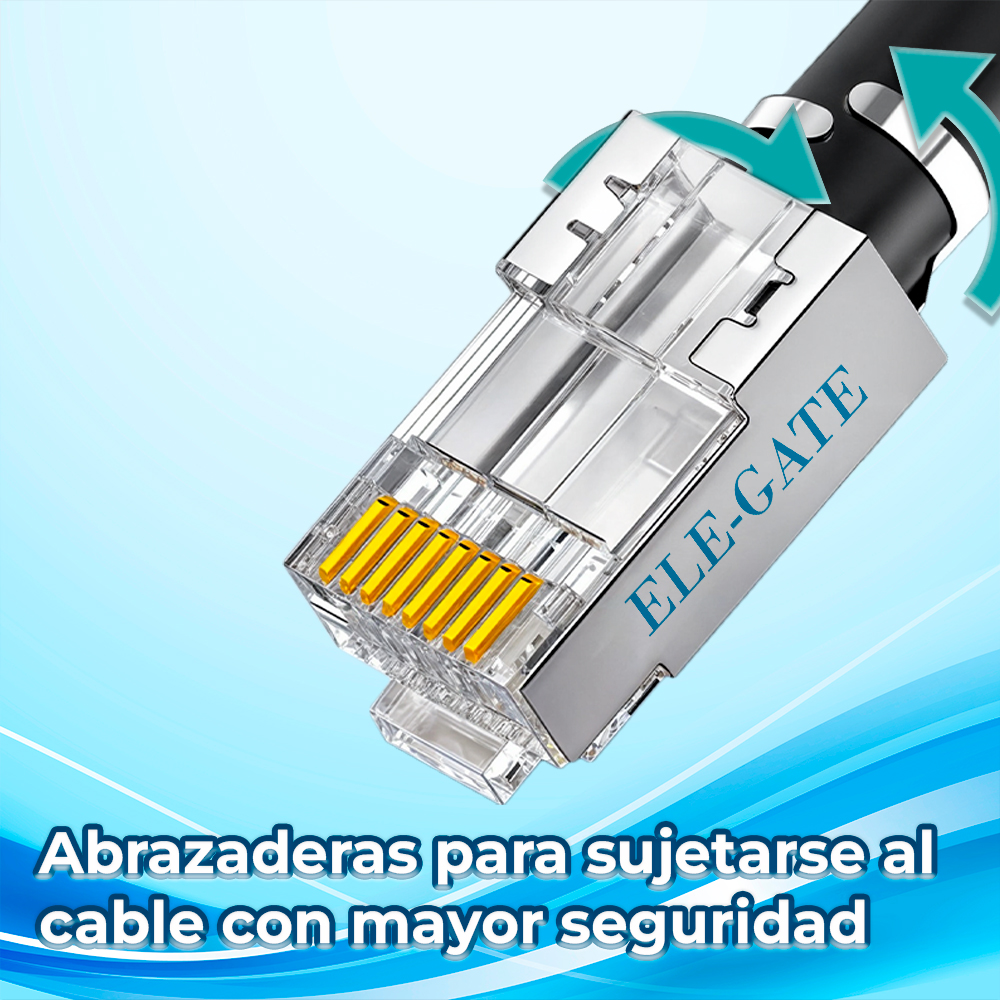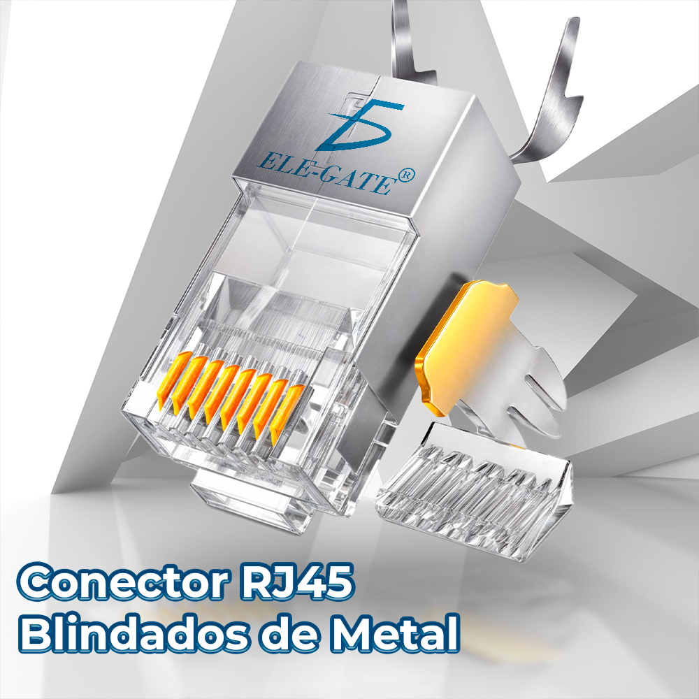 Descubre nuestro paquete de 100 conectores RJ45 con blindaje de aluminio, ideales para cables CAT6, CAT5E y CAT5. Diseñados con un empaque tipo clams y chapados en oro, estos conectores cuentan con fondo transparente para facilitar la verificación de secuencias. Su ranura especial permite que los cables sobresalgan adecuadamente, asegurando una conexión óptima. Perfectos para la construcción de cables de red personalizados, garantizan una transmisión de datos eficiente con velocidades de hasta 10 Gbps. La terminación 8P8C con contacto escalonado de tres puntos ofrece estabilidad y seguridad, mientras que el blindaje de aluminio aumenta su durabilidad y resistencia. La agarradera proporciona un ajuste firme, haciendo de estos conectores la opción perfecta para uso personal y profesional.