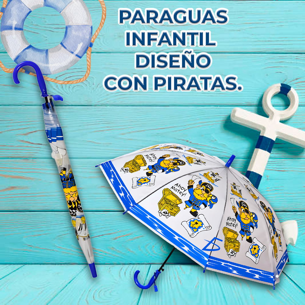 Paraguas Trasparente Impermeable con Diseño de Piratas Intrépidos . Protege a tus peques de la lluvia y diviertete con su diseño. Con su tela resistente y su varillas que aguantan fuertes vientos.