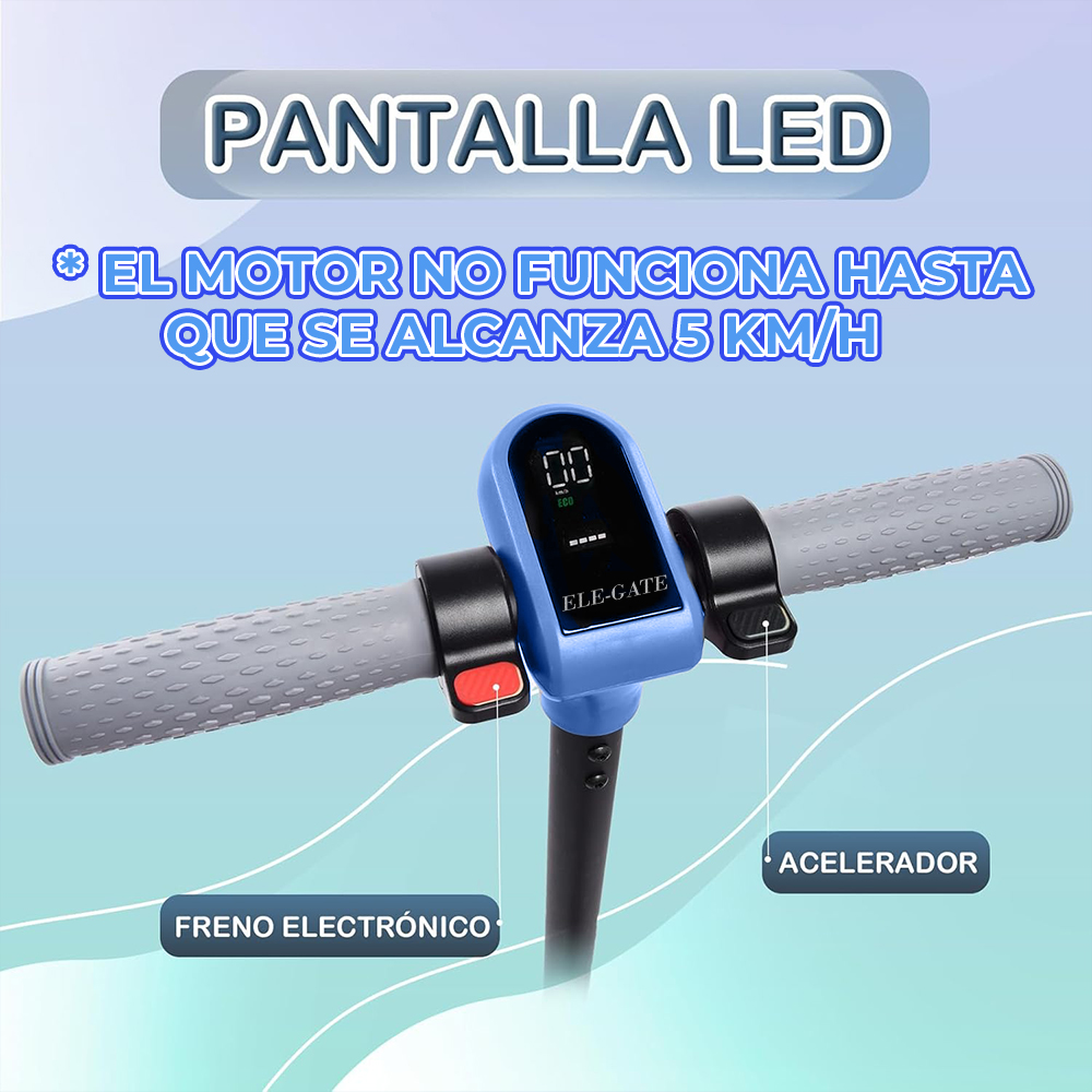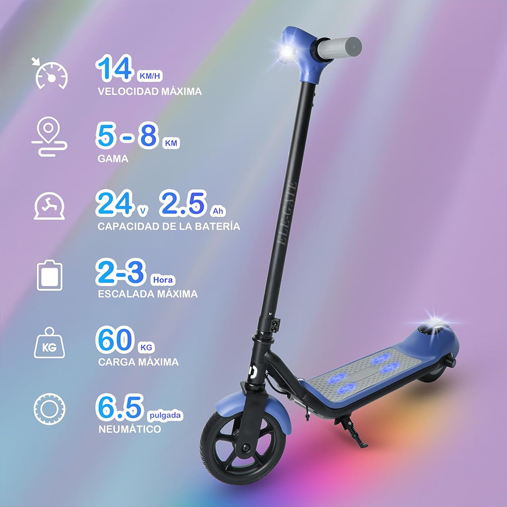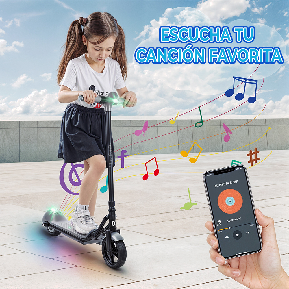 Patín Eléctrico para Niño con bocina Bluetooth y Luz RGB, 110W de potencia y velocidad máxima de 14 km/h. Diseño moderno con luces RGB y Bocina para mayor diversión. Seguro y confiable con velocímetro y límite de velocidad de 8 km/h para principiantes. Batería de carga rápida para más tiempo de uso con menos espera. Ideal para niños que buscan aventura con estilo.