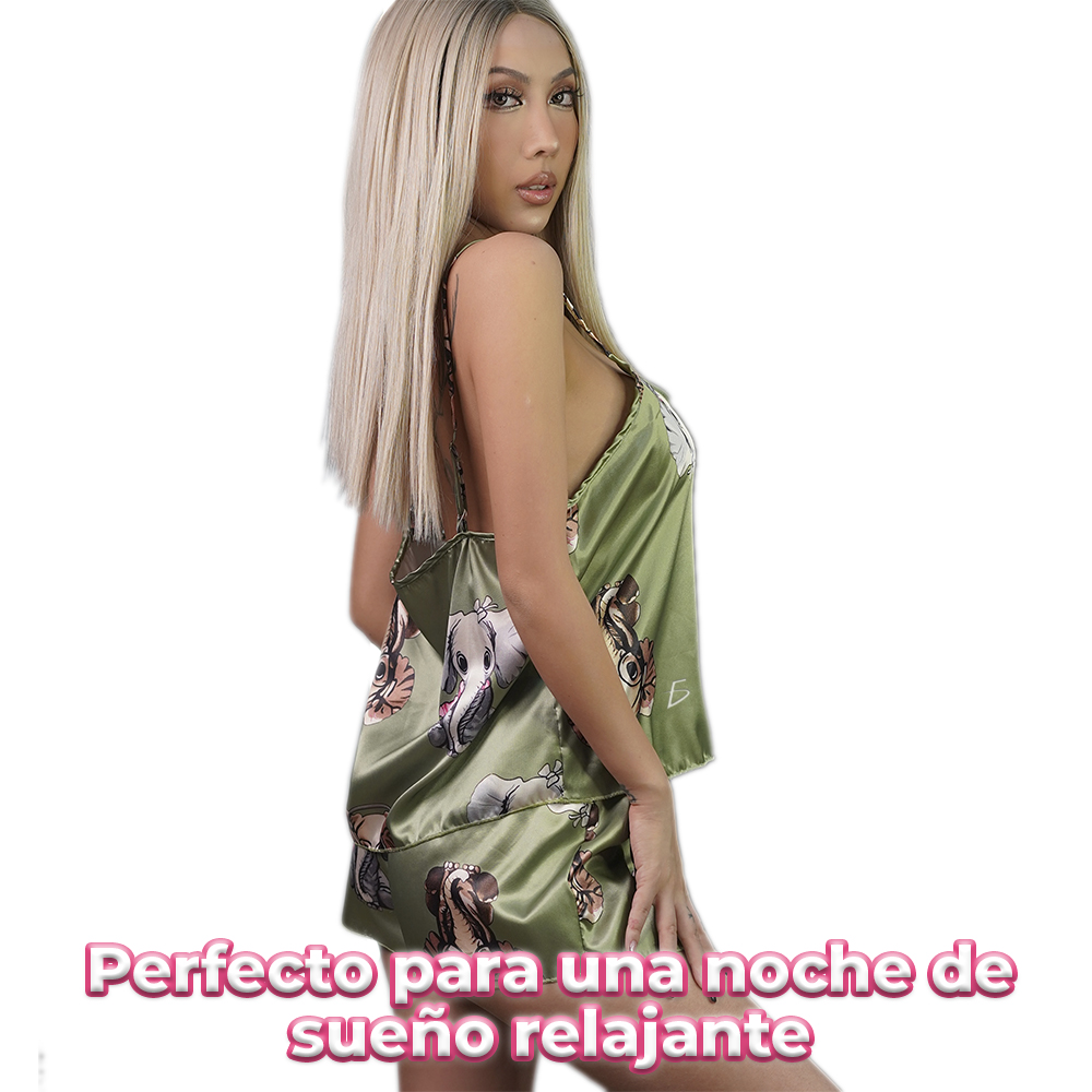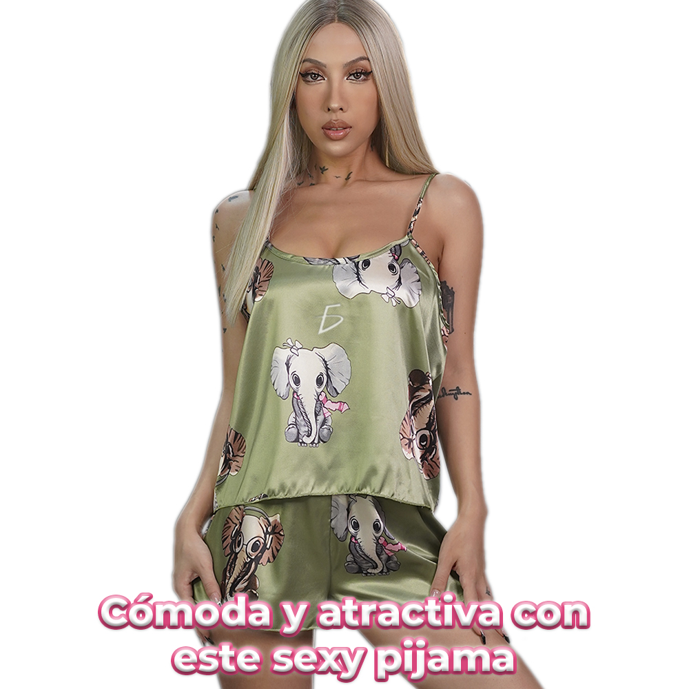 Pijama Sexy de Satén con Estampado de Elefantes para Mujer