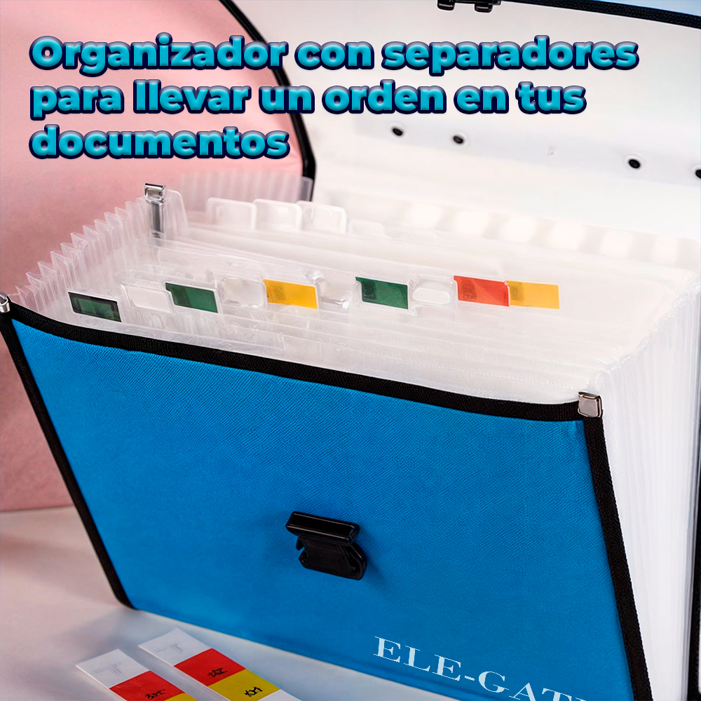 Porta Documentos Escolar Tamaño A4 con Separadores y Banderas de Colores. Ideal para guardar tus documentos importantes, organizar tus apuntes o llevar tus papeles importantes contigo. Con su broche de seguridad evitas que se extravíen.
