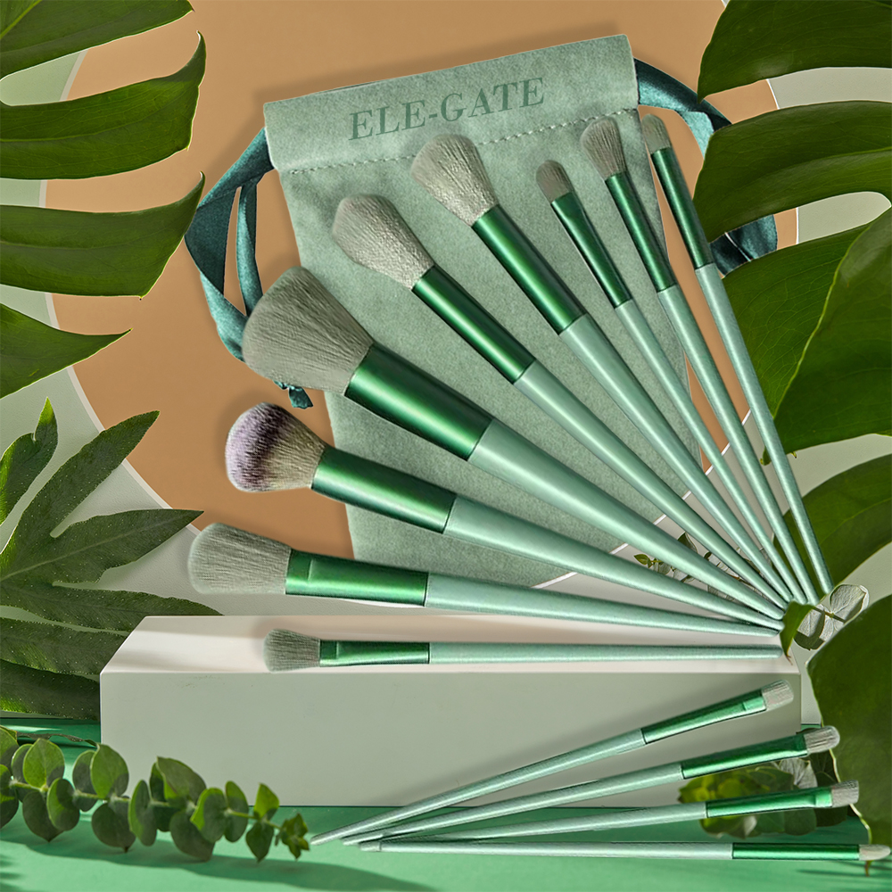 Set de 13 Brochas Color Esmeralda con Mango Barnizado. Set completo para un maquillaje perfecto incluye brochas para delinear y definir cada una de las partes del rostro. Con cerdas suaves pero firmes que logran un acabo profesional en tu maquillaje.