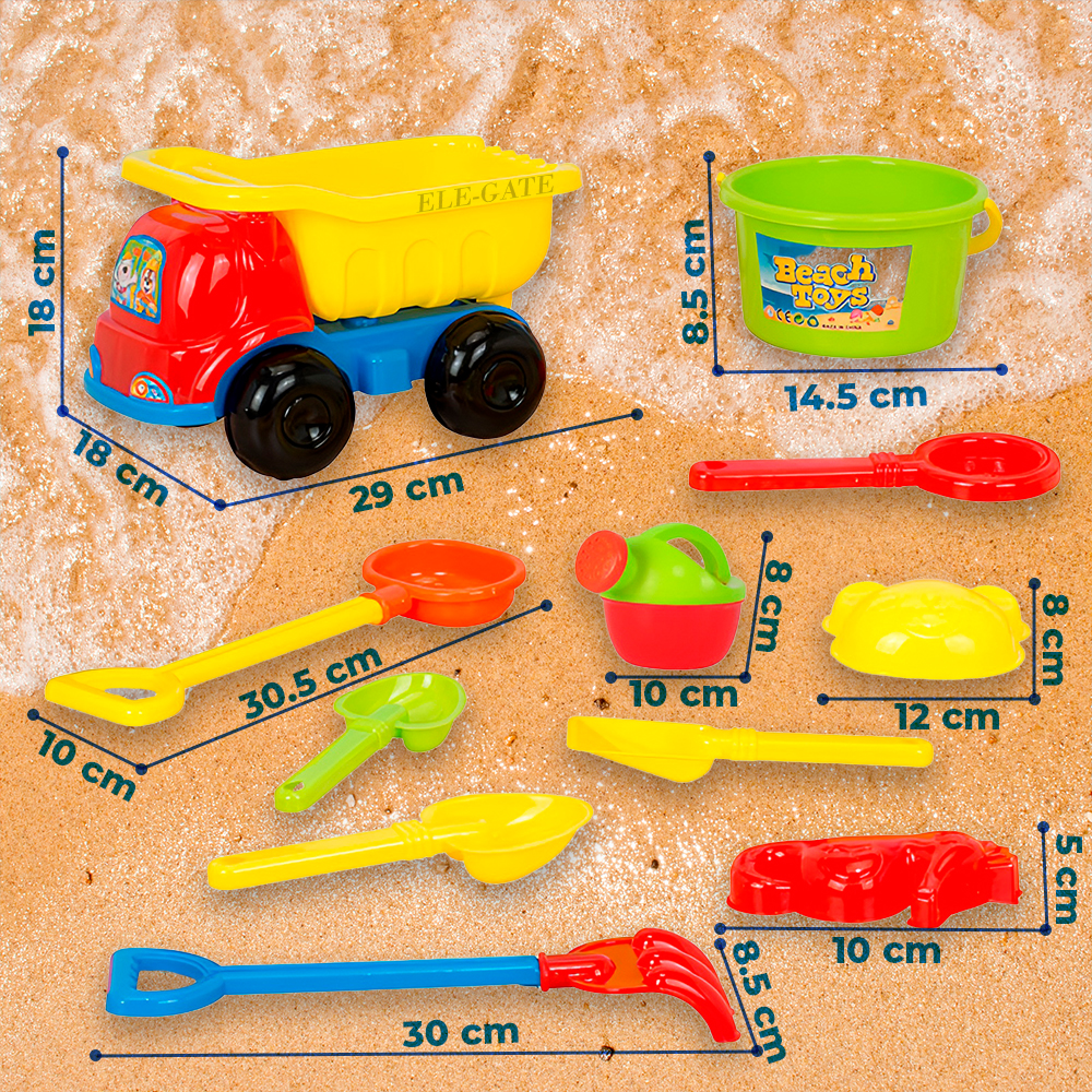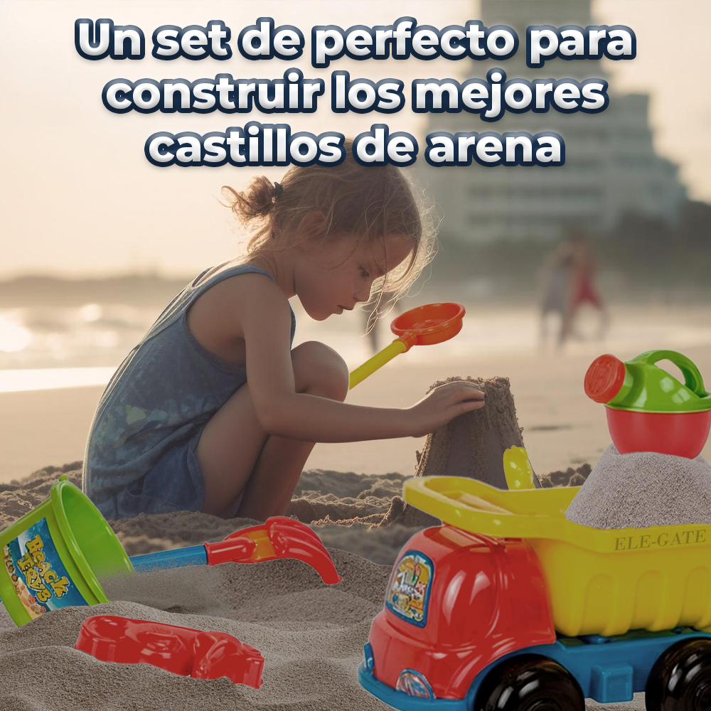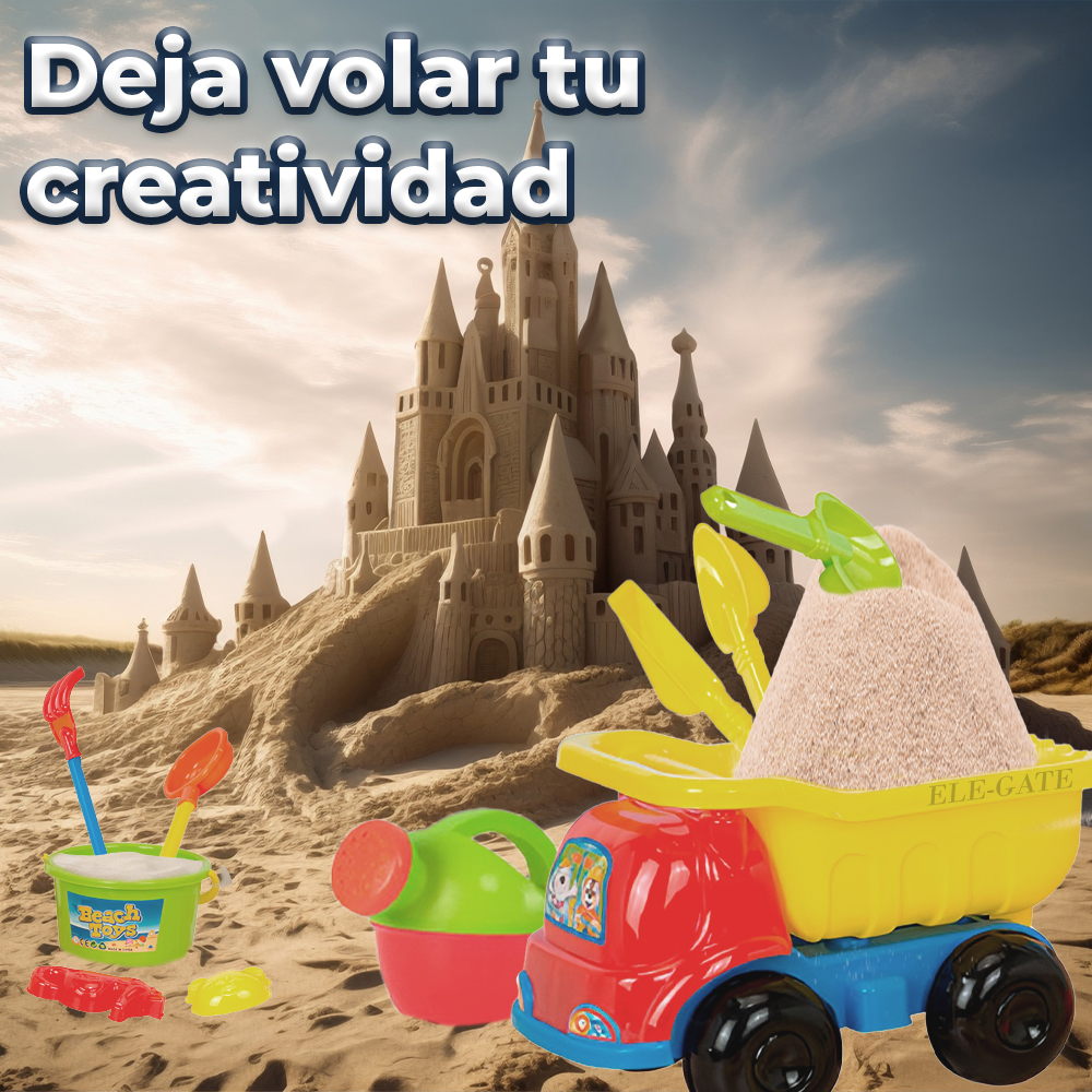 Set de Playa de 11 piezas, super completo e ideal para toda la familia incluye: 6 palas, un camioncito con caja movible y una cubeta y dos moldes de arena. Diviértete en grande y haz que lo único que te detenga es tu imaginación.