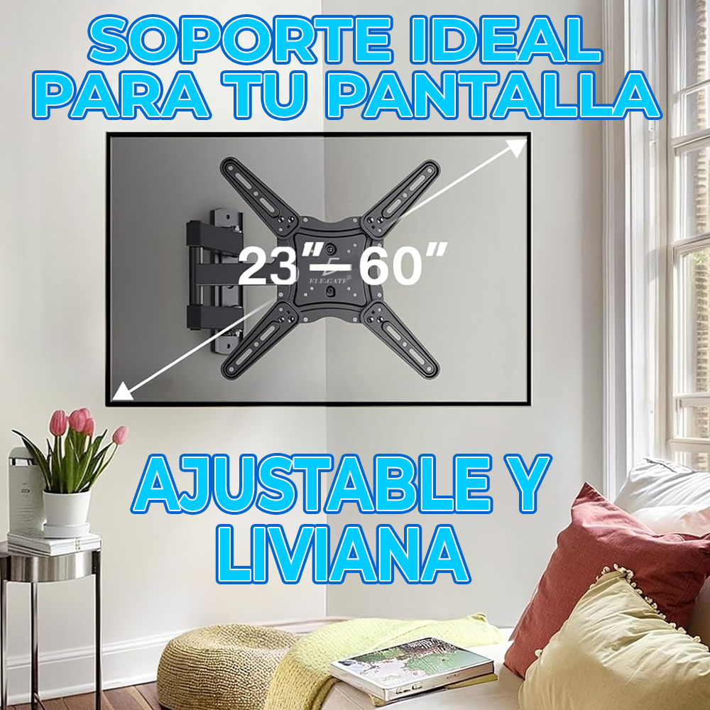 Este soporte de pared es perfecto para televisores de 23 a 60 pulgadas, ofreciendo máxima seguridad y versatilidad. Con capacidad de carga de hasta 35 kg, garantiza estabilidad en cualquier tipo de pared.