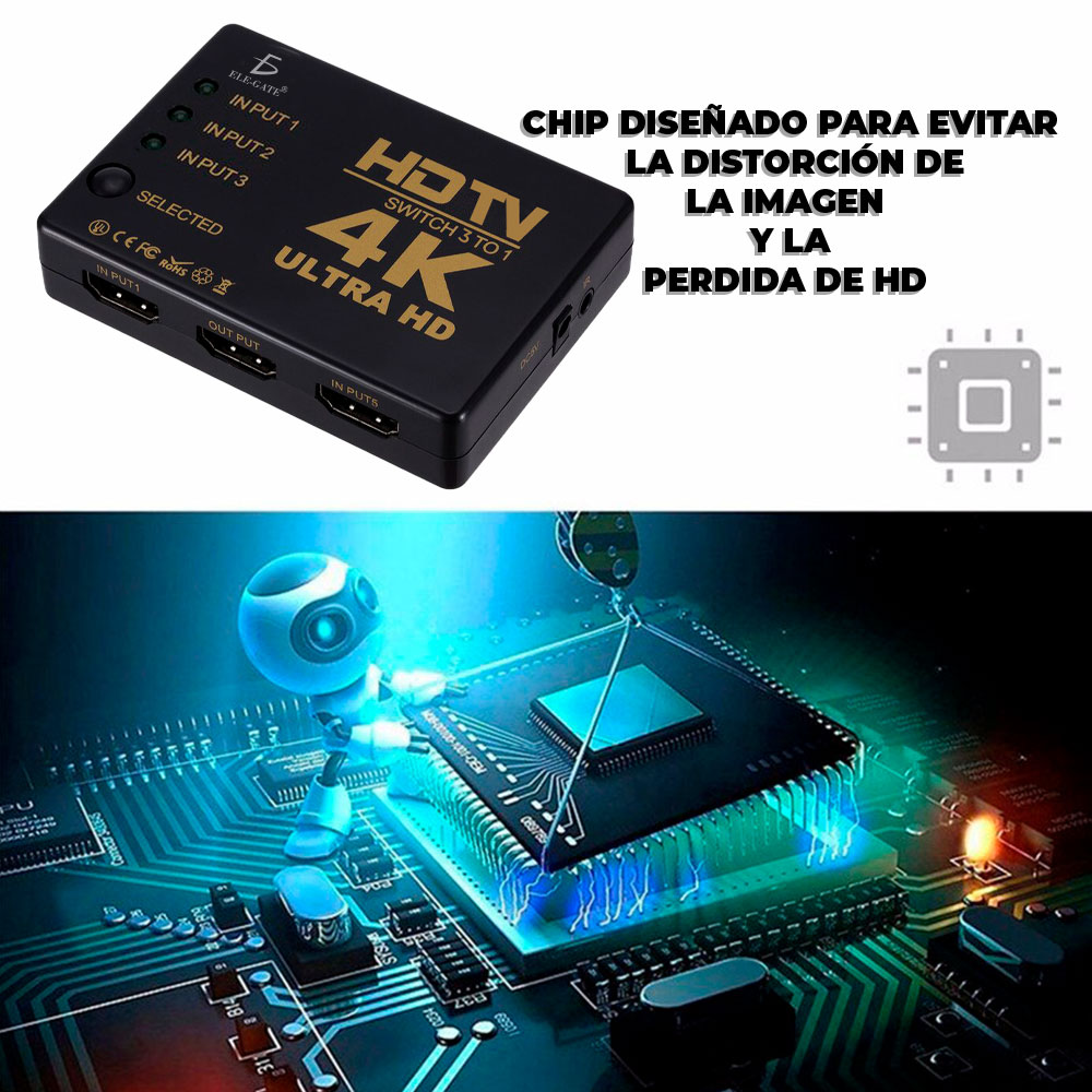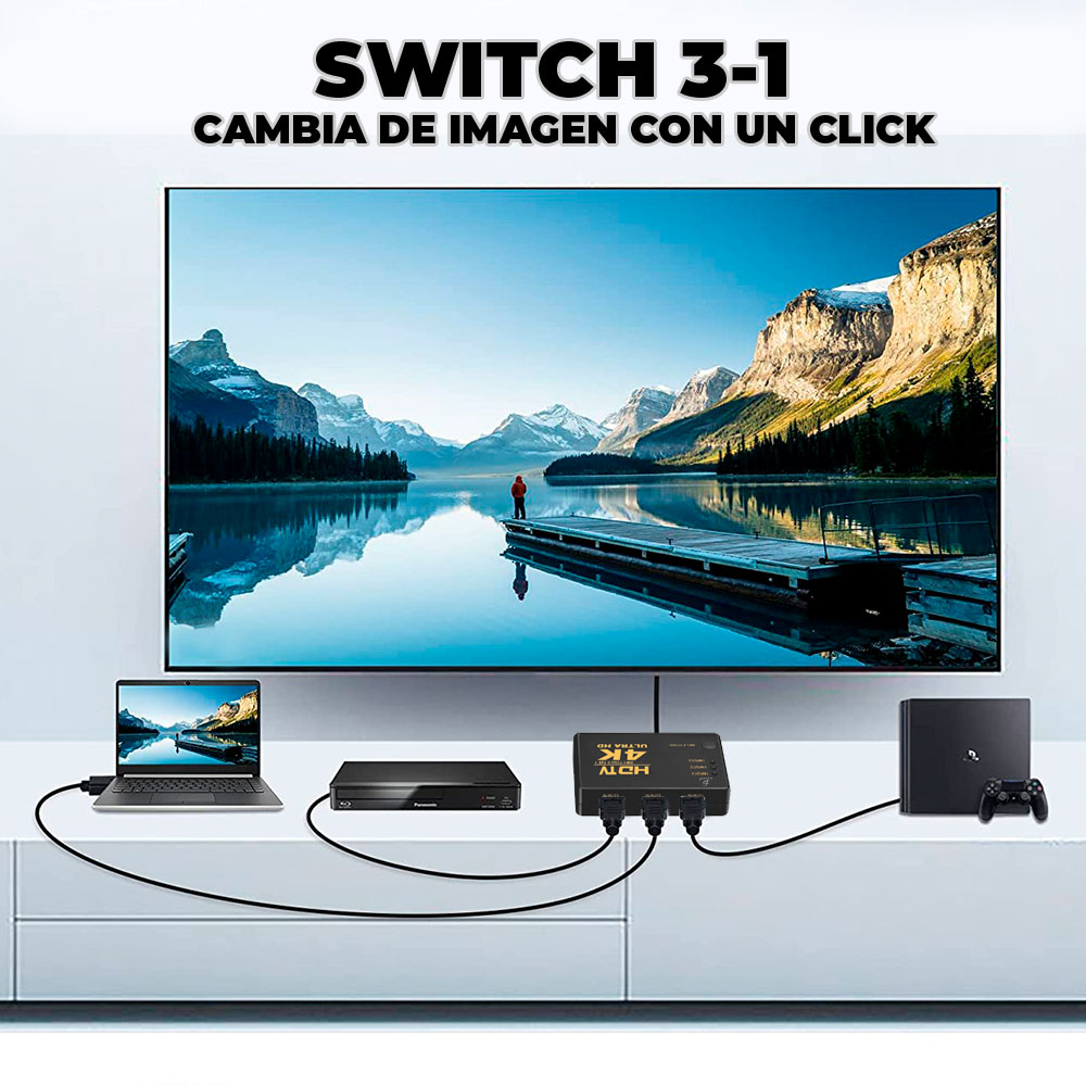 El switch conmutador enruta una señal HDMI de tres fuentes direccionándolas a una sola fuente HDMI, que reproduce la misma calidad de la imagen.