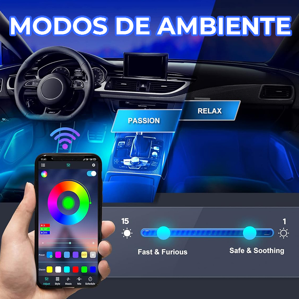 Transforma el interior de tu vehículo con este kit completo de iluminación LED RGB. Fácil de instalar, resistente y totalmente personalizable, incluye control remoto y compatibilidad con app móvil para que elijas tu ambiente ideal en segundos.