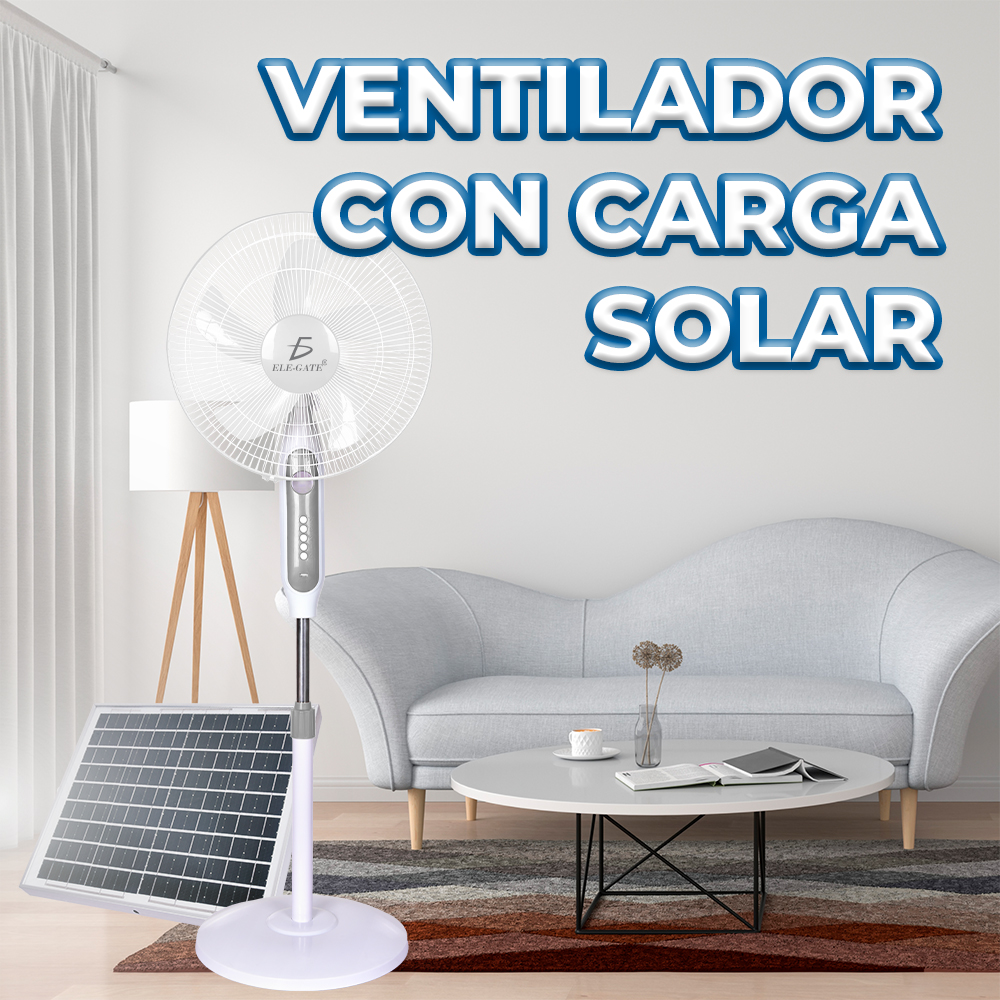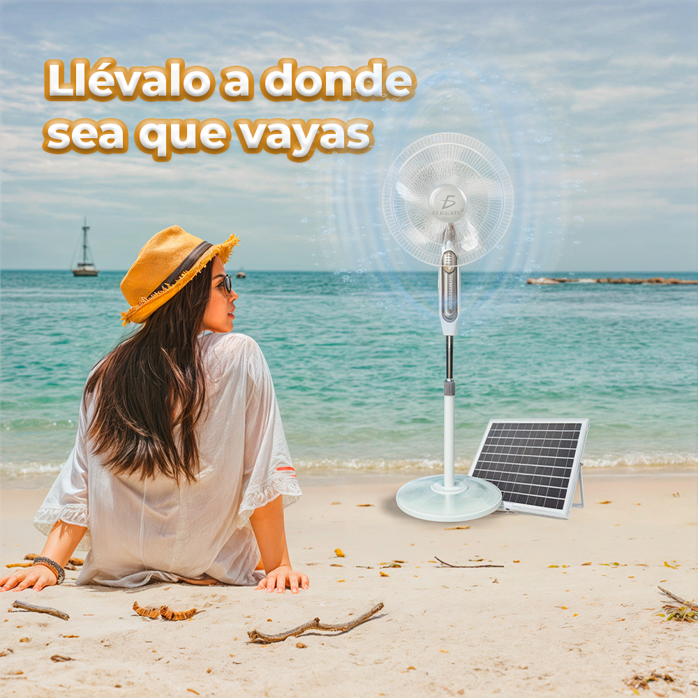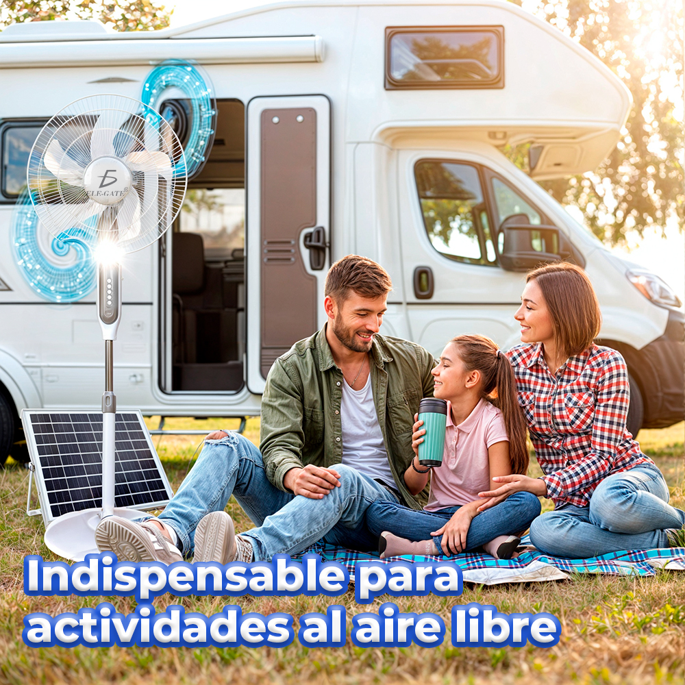 Ventilador Solar con luz y entrada USB, con pedestal y niveles de potencia